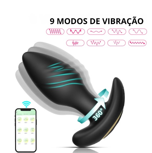Plug anal vibratório por aplicativo em silicone com rotação 360°. Possui toque suave, aveludado e detalhes metalizados na base.