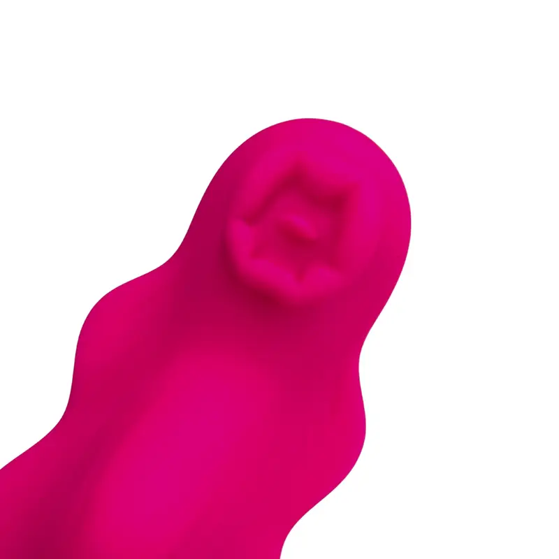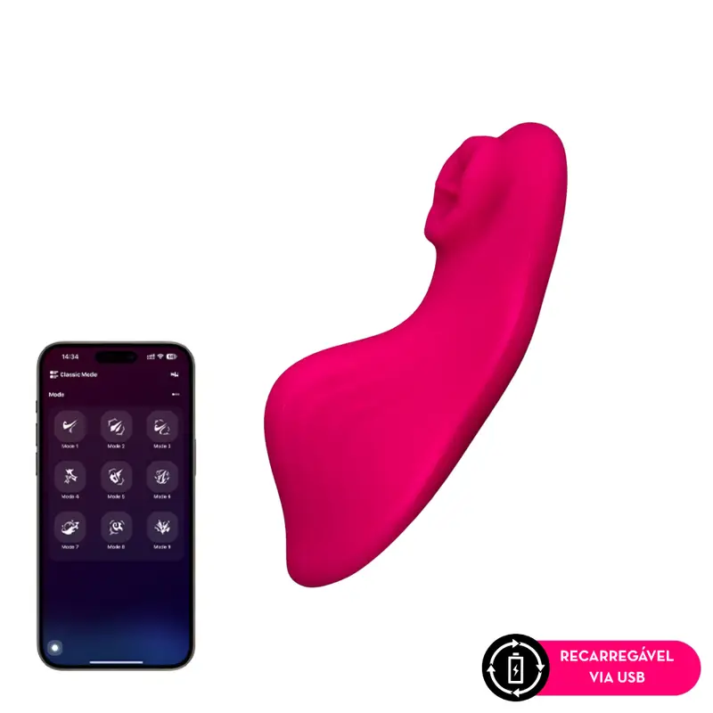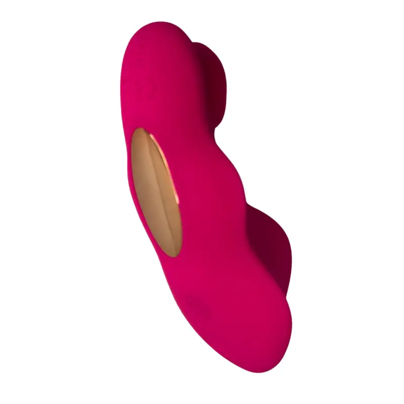 Vibrador de calcinha compacto com formato de língua na ponta, controlado por aplicativo. Proporciona estímulo contínuo, ideal para uso externo e experiências personalizadas.