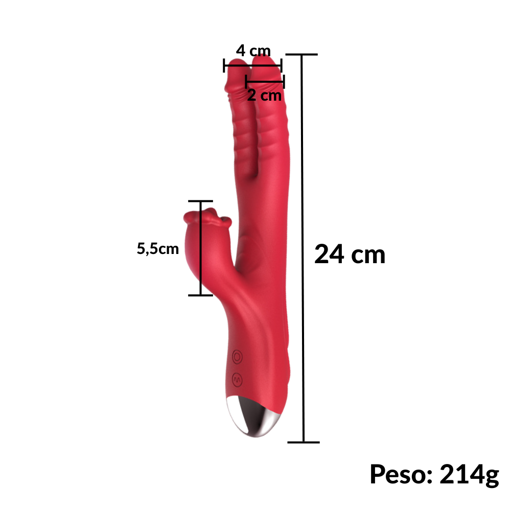 Medidas: Tamanho total – Comprimento total: 24 cm – Peso: 214 g – Hastes duplas (penetração) – Comprimento penetrável: aproximadamente 17–18 cm (estimado com base na proporção) – Largura da haste maior: 4 cm – Largura da haste menor: 2 cm