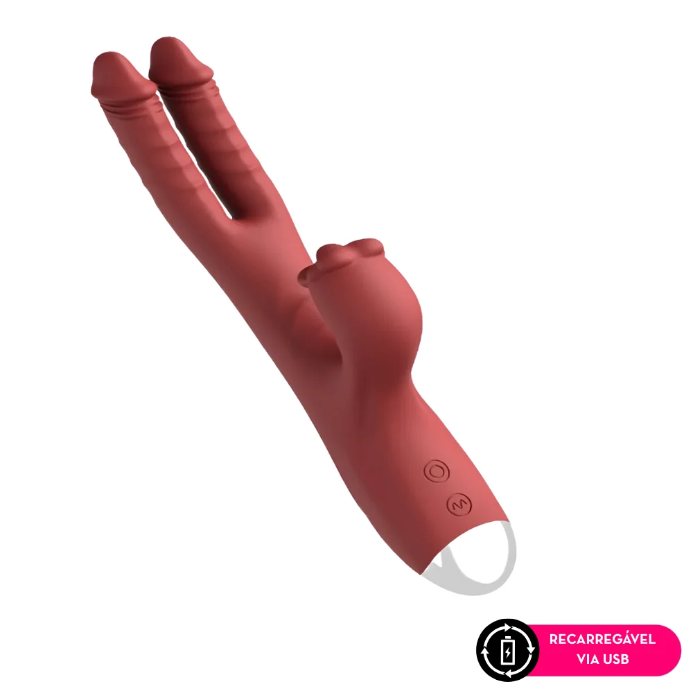O Vibrador Duplo combina estimulação interna e externa em um único dispositivo. Com design anatômico e duas hastes independentes, ele oferece penetração dupla simultânea e vibrações intensas. A estrutura lateral conta com um estimulador clitoriano com formato anatômico que envolve a região para proporcionar sucção vibratória.